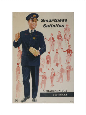 Subject: Internal poster advising staff to keep their uniforms smart; featuring a contemporary postman in the foreground with a selection of postmen through the ages in the background