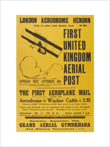 Subject:Poster advertising the 'First United Kingdom Aerial Post' from London Aerodrome Hendon to Windsor Castle, Saturday September 9th 1911.