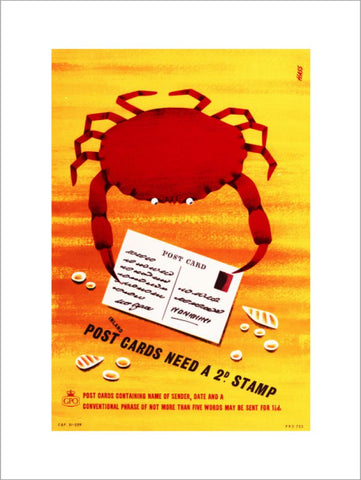 Subject: Poster advertising post card rates; featuring a crab looking at a postcard on a beach