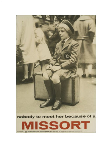 Subject: Internal poster on the subject of the dangers of mis-sorting; featuring a photograph of schoolgirl sitting alone on her suitcase at a train station