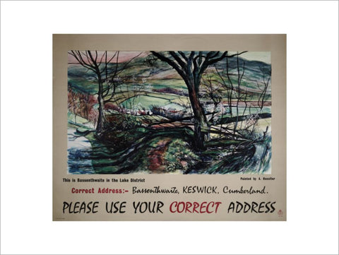 Subject: Poster advising on correct addressing of mail; featuring Bassenthwaite in Keswick, Cumberland