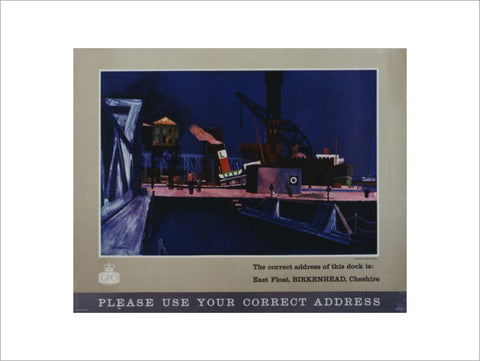 Subject: Poster advising on correct addressing; featuring a painting of a dock in Birkenhead, Cheshire