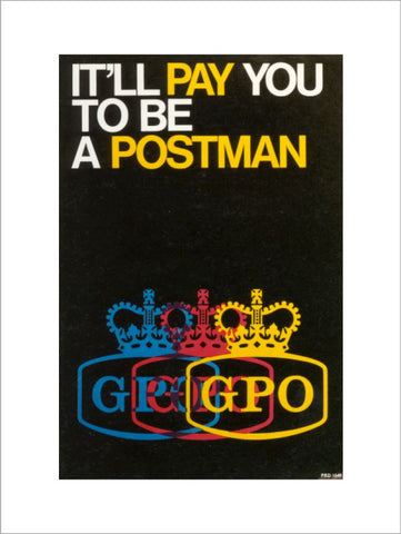 Subject: Poster recruiting for postal personnel in the London Postal Region; featuring a GPO Crown badge in yellow, red and blue