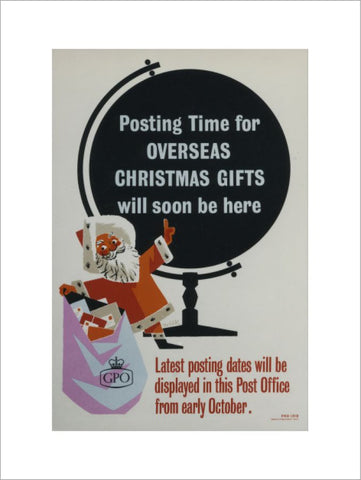Subject: Poster advertising the final overseas posting dates for Christmas mail; featuring Father Christmas and a black globe