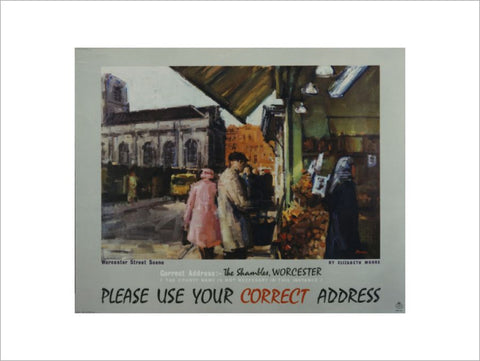 Subject: Poster advising on correct addressing of mail; featuring the Shambles in Worcester
