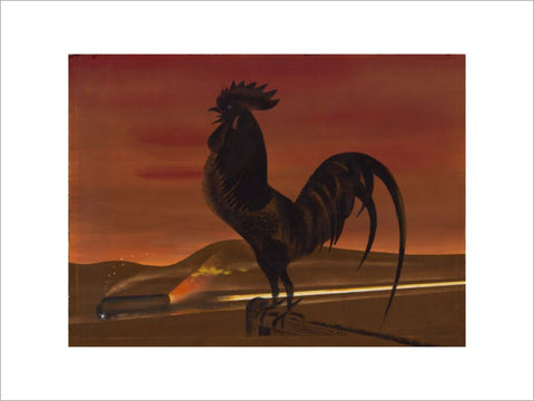 Subject: Artwork for a Nightmail poster and publicity material, featuring a cockerel perched on a wooden post in the foreground and a train streaking through the landscape behind, set against a warm orange dawn sky.